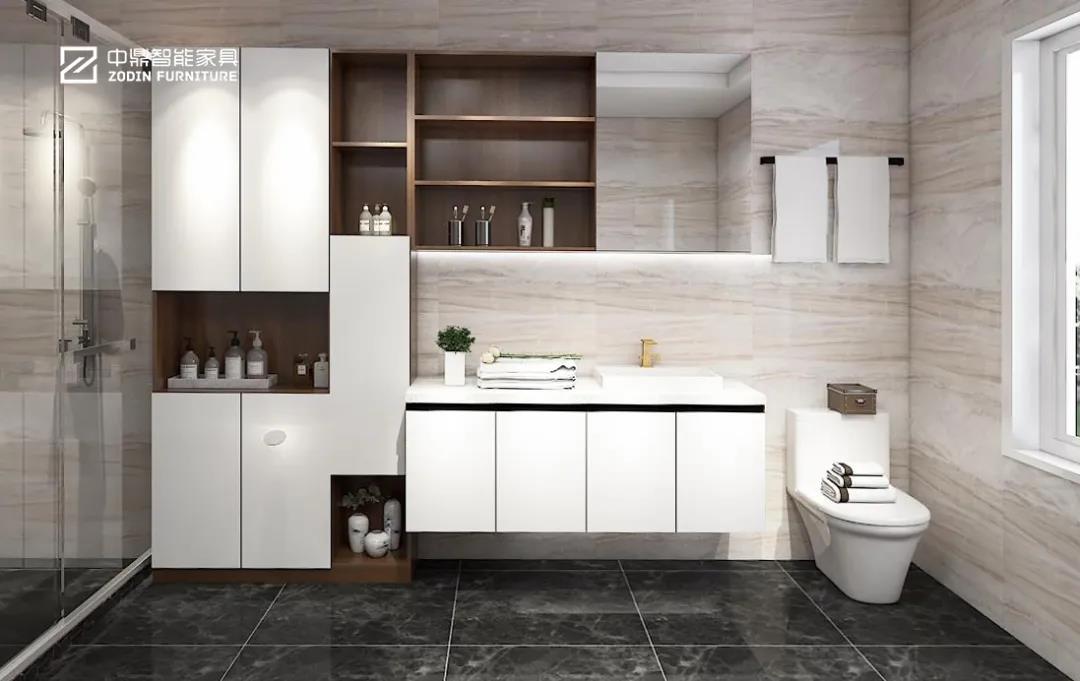 衛生間雖然是家中面積小的空間,但卻是值得關注細節的地方。定制合適尺寸的全鋁浴室柜,讓柜體和墻體整體融合。側邊的開放柜設計,更讓小物件的收納得心應手。